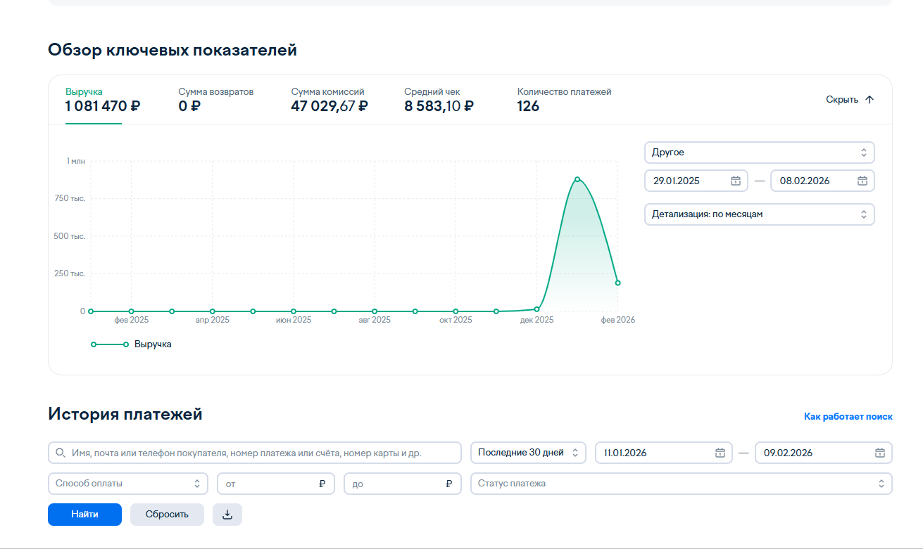 Прилагаю скриншот из ЮKassa одного из моих сайтов. Результат: 1 081 470 рублей продаж из интернета всего за 42 дня.